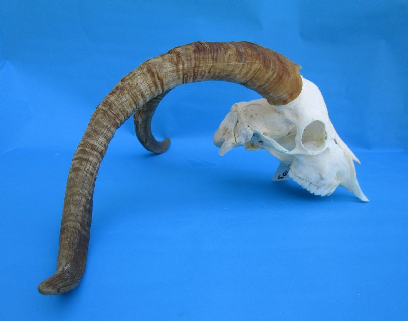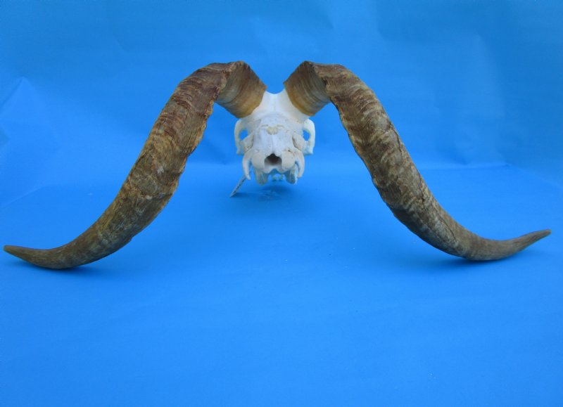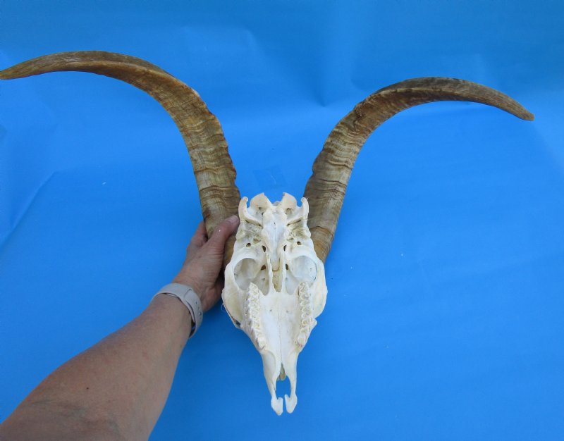 African Angora Skull for Sale with 21-3/4 and 22-3/4 inches Horns imported from South Africa.  The skull measures approximately 9-3/4 inches long. (Missing couple teeth).  Angora goats are small-sized goats that are raised for their mohair, a type of fiber used in clothing and upholstery. South Africa is the world's leading producer of mohair, and Angora goats are the most efficient fiber producers in Southern Africa