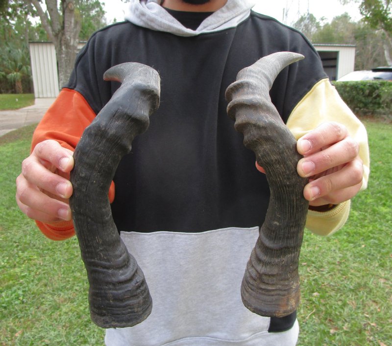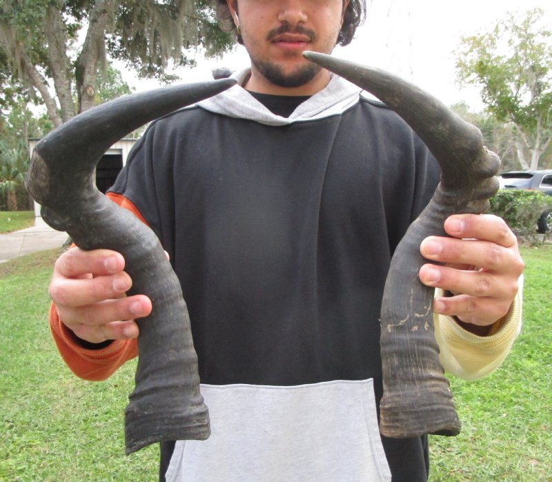 Two Single Red Hartebeest Horns for taxidermy crafts. One red hartebeest horn measures approximately 17 and the other measures approximately 17-1/2 inches (one right, one left), (measured around the curve of the horn using a cloth tape measure.  These horns are NOT A PAIR. These horns are 100% Real and will have natural imperfections from the animal living in the wild, fighting and aging. Review all photos carefully. You are buying the 2 horns pictured.