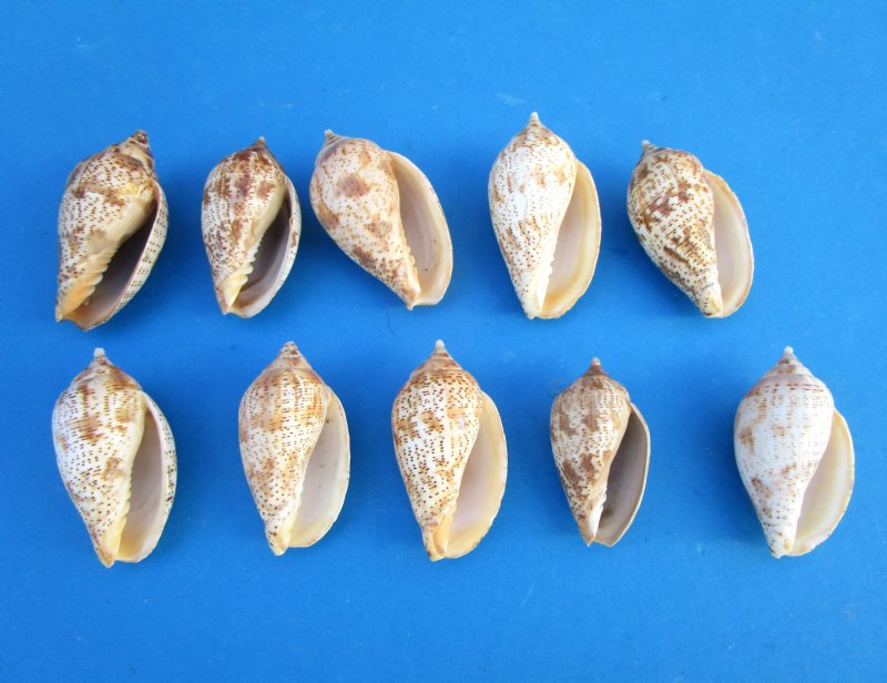 Voluta Lapponica shells, also known as Harulina lapponica for hermit crab changing shells and a colorful shell prized by shell collectors for its markings. Harpulina lapponica or Voluta Lapponica, is a species of sea snail in the family Volutidae, the volutes and found in the Indian Ocean. The exterior of the voluta lapponica shell is peach colored to tan with numerous vertical rows of dark brown patches. They measure between approximately 2 inches to 2-1/2 inches in size. Some may be a little under or over the size. They make a pretty focal point when placed in a glass container.